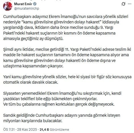 “Cumhurbaşkanı adayımız Ekrem İmamoğlu’nun savcılara yönelik sözleri nedeniyle “kamu görevlisine görevinden dolayı hakaret” iddiasıyla yargılandığı dava, iktidarın daha önce meclise sunduğu 9. Yargı Paketi’ndeki hakaret suçlarının bir kısmını ön ödeme kapsamına almasıyla geçtiğimiz ay düşmüştü.