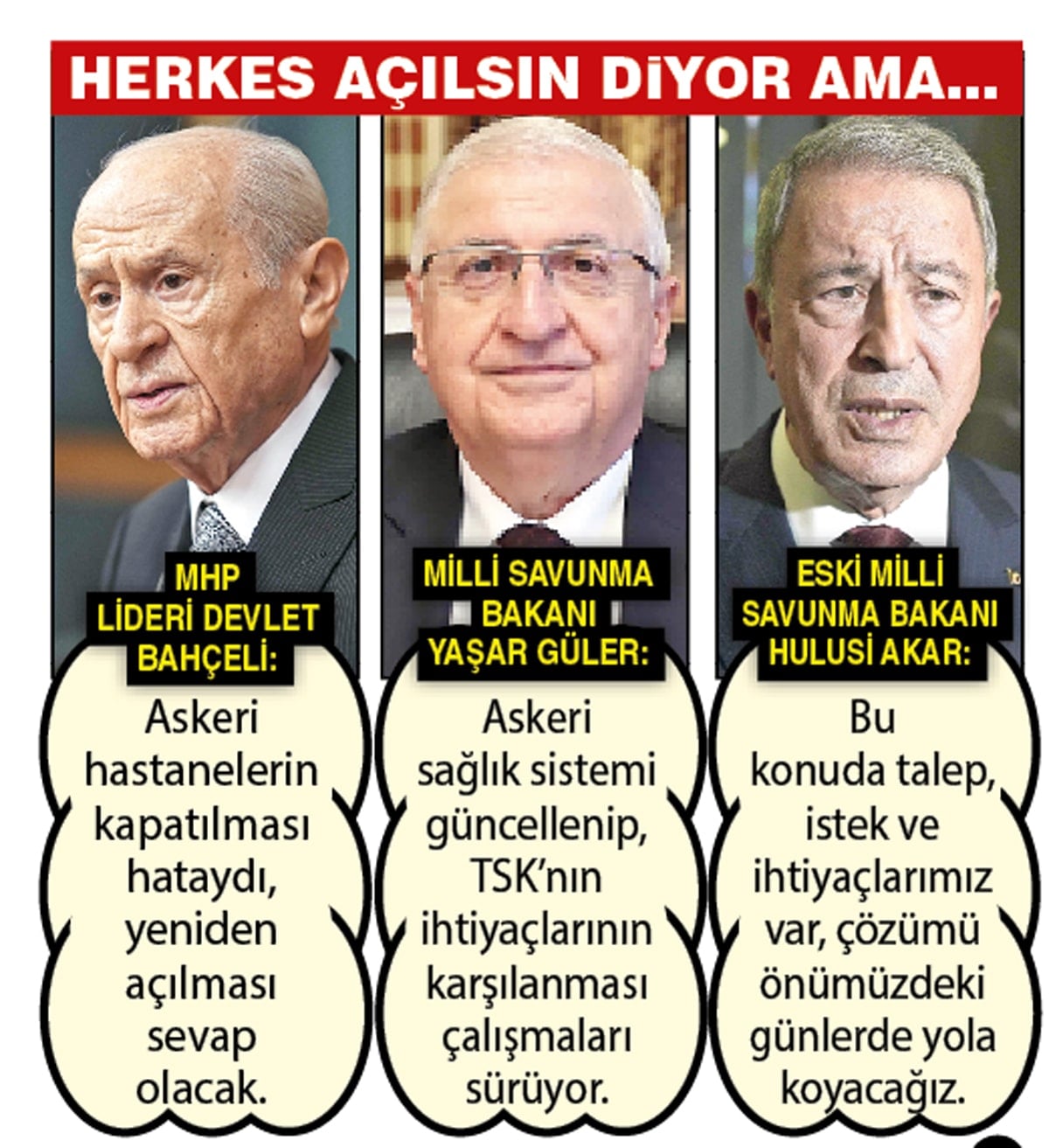 15 Temmuz darbe girişimi sonrası kapatılan askeri hastanelerin yeniden faaliyete geçeceği açıklandı ancak bu açıklamanın üzerinden tam 896 gün geçmesine rağmen açılan hastane olmadı. 11 Ağustos 2022 günü dönemin Milli Savunma Bakanı Hulusi Akar, “Bu konuda talep, istek ve ihtiyaçlarımız var, çözümü önümüzdeki günlerde yola koyacağız” diyerek askeri hastanelerin açılacağını söylemişti.