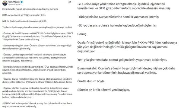 İmralı heyetinin ziyaret sonrası notlarını partileriyle paylaştığını savunan Tayyar, “DEM ayrıca Kandil ve YPG’ye mesajları iletti. MİT de devletin zirvesine tutanakları götürdü. Trafik geniş alana yayılınca İmralı notları da gün ışığına çıkmaya başladı” ifadelerini kullandı.