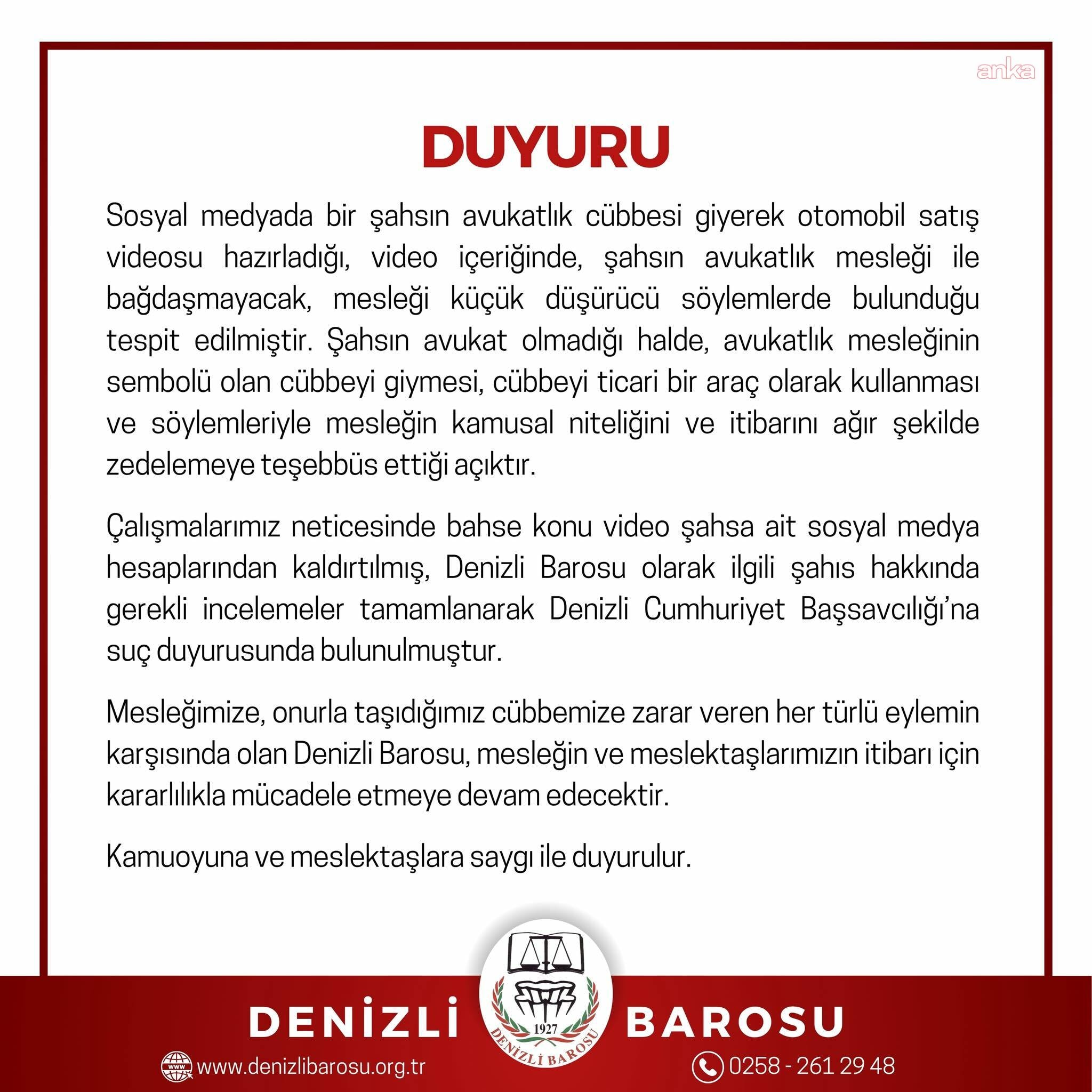 Olay, Denizli’de faaliyet gösteren bir galericinin satışa sunduğu aracı tanıtmak için avukat cübbesiyle kamera karşısına geçmesiyle ortaya çıktı. Sosyal medyada paylaşılan görüntüler, kısa sürede çok sayıda avukat ve vatandaşın tepkisini çekti.