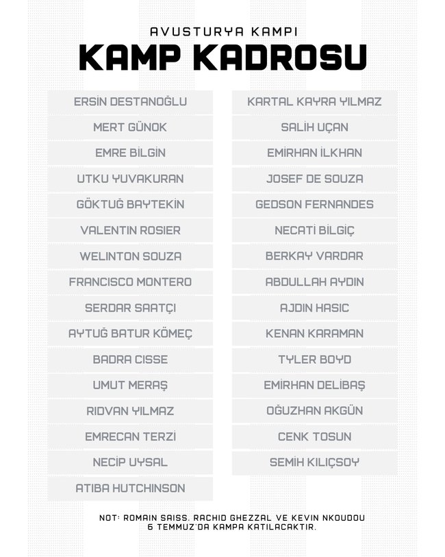 “Ersin Destanoğlu, Mert Günok, Emre Bilgin, Utku Yuvakuran, Göktuğ Baytekin, Valentin Rosier, Welinton, Montero, Serdar Saatçı, Aytuğ Batur Kömeç, Badra Cisse, Umut Meraş, Rıdvan Yılmaz, Emrecan Terzi, Necip Uysal, Atiba, Kartal Kayra Yılmaz, Salih Uçan, Emirhan İlkhan, Josef, Gedson, Necati Bilgiç, Berkay Vardar, Abdullah Aydın, Hasic, Kenan Karaman, Boyd, Emirhan Delibaş, Oğuzhan Akgün, Cenk Tosun, Semih Kılıçsoy.”