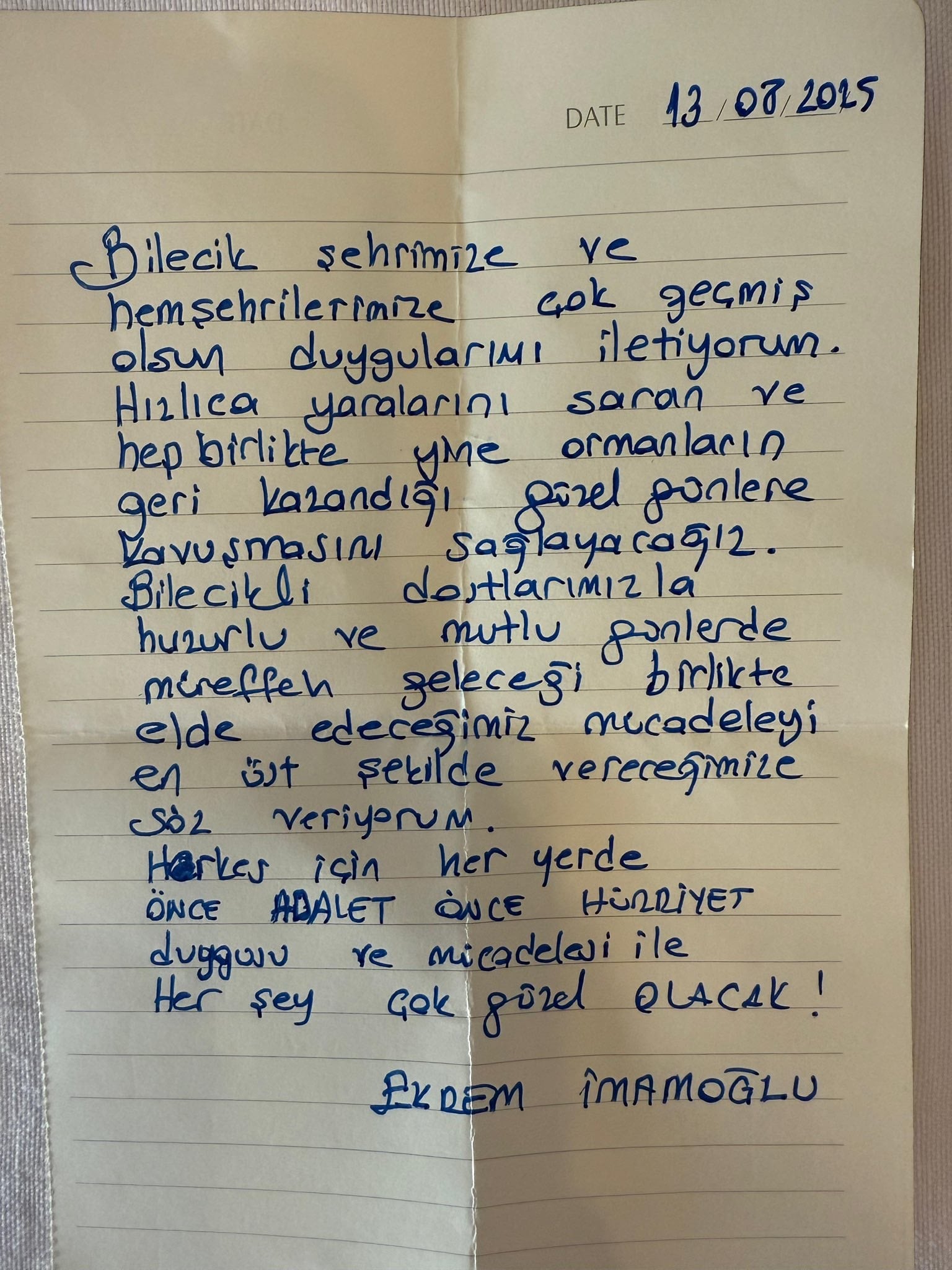 Ziyarette İmamoğlu, kendi el yazısıyla Bileciklilere bir mesaj göndererek, geçtiğimiz günlerde kentte yaşanan ve büyük yıkıma neden olan orman yangınları için “geçmiş olsun” dileklerini iletti.