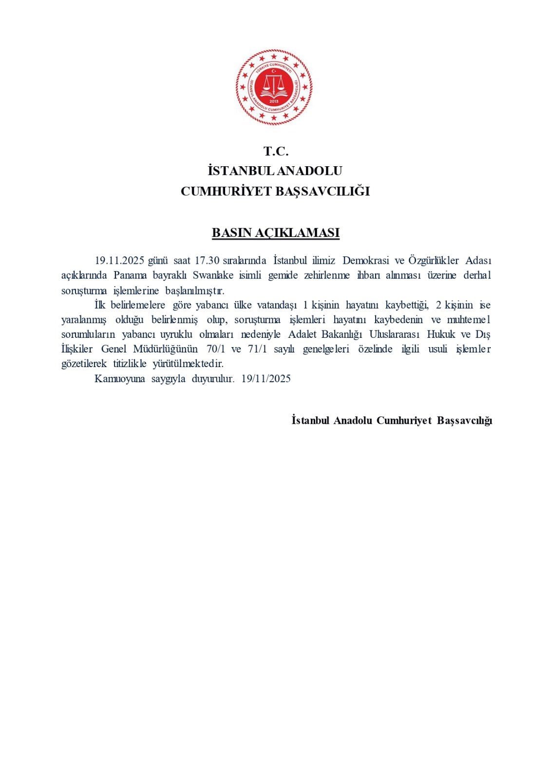 “19.11.2025 günü saat 17.00 sıralarında İstanbul İlimiz Demokrasi ve Özgürlükler Adawsı açıklarında Panama bayraklı Swanke isimli gemide zehirlenme ihbarı alınması üzerine derhal soruşturma başlatılmıştır.