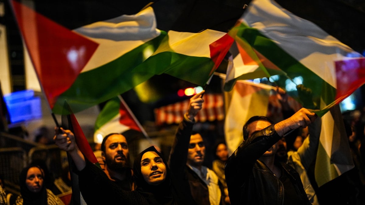 Anadolu Gençlik Derneği (AGD) İstanbul Üniversiteler Komisyonu ve Saadet Partisi İstanbul Gençlik Kolları tarafından düzenlenen eylem için bir araya gelen vatandaşlar Filistin bayraklarıyla konsolosluk önünde toplandı.