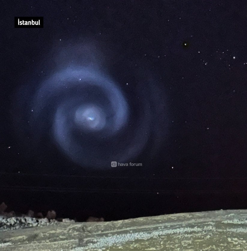 “Fotoğraftaki spiral şeklindeki ışık, büyük olasılıkla 24 Mart 2025’te Cape Canaveral’dan fırlatılan SpaceX Falcon 9 NROL-69 roketinden kaynaklanıyor. Bu, roketin ikinci aşamasının yakıt boşaltması sırasında dönmesiyle oluşuyor.