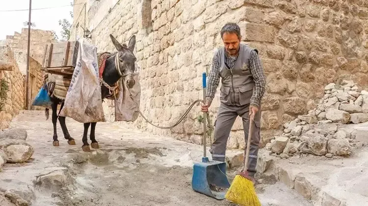Güneydoğu Anadolu Bölgesi’nin en önemli turizm merkezlerinden biri olan Mardin’in araç girmeyen dar ve merdivenli sokaklarındaki çöpler, yıllardır Artuklu Belediyesi’nin kadrolu eşekleriyle toplanıyor. Sabahın erken saatlerinde, başlarında 1 belediye personeli ile başlanan ve saat 10.00’a kadar süren çöp toplama işlemi 5 saatlik dinlenme ve yemek molasının ardından saat 17.00’ye kadar devam ediyor. İş bittikten sonra belediyenin kendileri için oluşturduğu tarihi alanda kalan eşekler, ortalama 7 yıl çalıştırıldıktan sonra emekli ediliyor. Emekliye ayrılan eşekler, hayatlarının geriye kalan kısmını yine belediyeye ait barınakta tamamlıyor.
