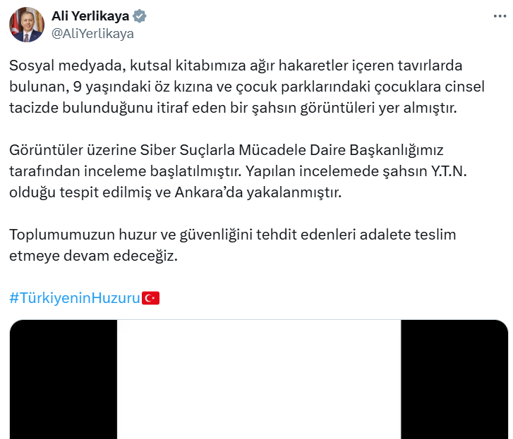 İçişleri Bakanı Ali Yerlikaya, sosyal medyada Kur'an'a hakaret eden ve 9 yaşındaki üvey kızıyla başka çocuklara cinsel tacizde bulunduğunu itiraf eden şüphelinin yakalandığını bildirdi.