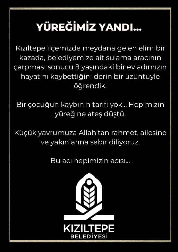 “Yüreğimiz yandı. Kızıltepe’de meydana gelen elim bir kazada, belediyemize ait sulama aracının çarpması sonucu 8 yaşındaki bir evladımızı kaybettik. Bir çocuğun kaybının tarifi yok. Küçük yavrumuza Allah’tan rahmet, ailesine sabır diliyoruz. Bu acı hepimizin acısı.”