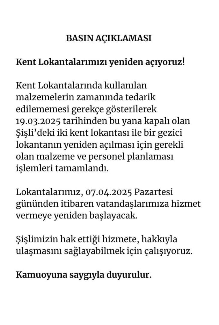19 Mart günü İstanbul Büyükşehir Belediyesi’ne (İBB) yapılan operasyon kapsamında seçilmiş Şişli Belediye Başkanı Resul Emrah Şahan gözaltına alınmış ve ardından tutuklanmıştı. Şişli’deki Kent Lokantaları o günden bu yana kapalı kalmıştı.