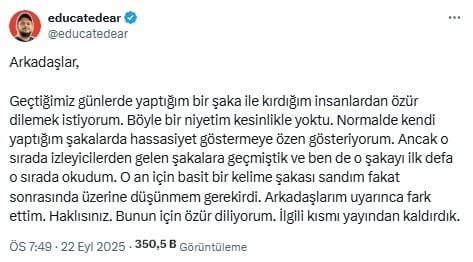 “Geçtiğimiz günlerde yaptığım bir şaka ile kırdığım insanlardan özür dilemek istiyorum. Böyle bir niyetim kesinlikle yoktu. Normalde kendi yaptığım şakalarda hassasiyet göstermeye özen gösteriyorum. Ancak o sırada izleyicilerden gelen şakalara geçmiştik ve ben de o şakayı ilk defa o sırada okudum. O an için basit bir kelime şakası sandım fakat sonrasında üzerine düşünmem gerekirdi. Arkadaşlarım uyarınca fark ettim. Haklısınız. Bunun için özür diliyorum. İlgili kısmı yayından kaldırdık.”