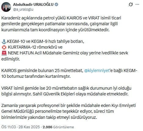 Karadeniz açıklarında petrol yüklü KAIROS ve VIRAT isimli ticari gemilerde gerçekleşen patlamalar sonrasında, çalışmalar ilgili kurumlarımızla tam koordinasyon içinde yürütülmektedir.