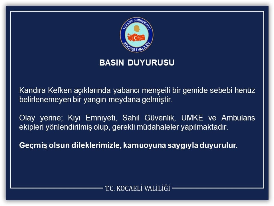 Kocaeli Valiliği’nden konuyla ilgili yapılan açıklamada, “Kandıra Kefken açıklarında yabancı menşeili bir gemide sebebi henüz belirlenemeyen bir yangın meydana gelmiştir. Olay yerine; Kıyı Emniyeti, Sahil Güvenlik, UMKE ve ambulans ekipleri yönlendirilmiş olup, gerekli müdahaleler yapılmaktadır. Geçmiş olsun dileklerimizle, kamuoyuna saygıyla duyurulur” ifadelerine yer verildi.