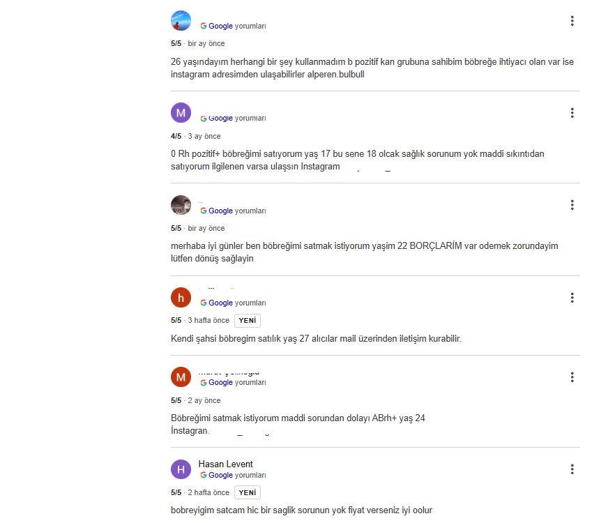 Türk Böbrek Vakfı’na (TBV) Google Maps üzerinden gelen yorumlarda çok sayıda kişinin böbreğini satmak istediği görüldü.