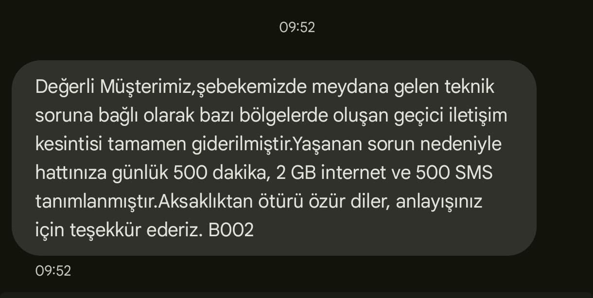 Turkcell tarafından tüm müşterilere gönderilen SMS’le 500 dakika, 2 GB internet ve 500 SMS hediye edileceği duyurulurken; Ulaştırma ve Altyapı Bakan Yardımcısı ve BTK E. Başkanı Dr. Ömer Fatih Sayan da saldırının sebeplerine ilişkin X hesabından şu açıklamayı yaptı: