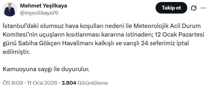 İstanbul’daki olumsuz hava koşulları nedeni ile Meteorolojik Acil Durum Komitesi’nin uçuşların kısıtlanması kararına istinaden; 12 Ocak Pazartesi günü Sabiha Gökçen Havalimanı kalkışlı ve varışlı 24 seferimiz iptal edilmiştir.”