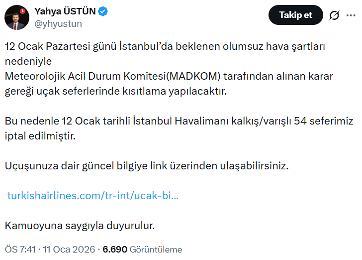 “12 Ocak Pazartesi günü İstanbul’da beklenen olumsuz hava şartları nedeniyle Meteorolojik Acil Durum Komitesi(MADKOM) tarafından alınan karar gereği uçak seferlerinde kısıtlama yapılacaktır.